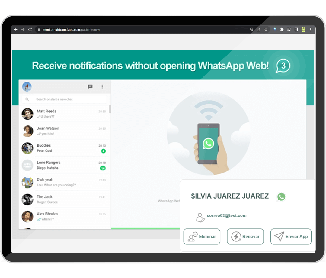 ¡App para teléfono gratis para todos tus pacientes! Ven su dieta y gráficas de progreso, intercambian alimentos equivalentes, ven recetas, alertas diarias de hábitos, chat, recordatorios y pagos